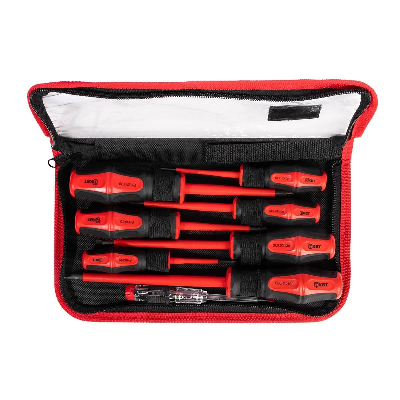 Состав набора - Отвертка диэлектрическая шлиц 2.5х75. Отвертка диэлектрическая шлиц 4.0х100. Отвертка диэлектрическая шлиц 5.5х125. Отвертка диэлектрическая шлиц 6.5х150. Отвертка диэлектрическая РН0х60. Отвертка диэлектрическая PH1х80. Отвертка диэлектрическая PH2х80. Отвертка индикаторная. Для работ под напряжением до 1000 В. Двухкомпонентные эргономичные рукоятки с мягкими прорезиненными вставками. Маркировка на торце рукояток с обозначением типа профилей. Специальная форма рукояток, не позволяющая инструменту скатываться с наклонной поверхности. Стержни из высокопрочной стали S2. Намагниченные наконечники. Упаковка - кофр на молнии с прозрачной крышкой. Вес набора - 576 г