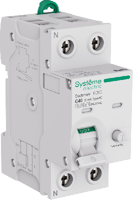 Автоматический выключатель дифференциального тока (АВДТ) S9D, серии Systeme9, Systeme Electric, 1P+N, номинальный ток 40 А, характеристика C, Icn - 6 кА, ток утечки - 30 мА, тип AC. Соответствует требованиям стандартов ГОСТ IEC 61009-1 и ГОСТ IEC 60947-2. Применяется в электрических сетях напряжением 230 В. Предназначен для защиты цепей от сверхтоков и для защиты людей от токов утечки при прямом (10 и 30мА) и косвенном (100мА) прикосновении к токоведущим частям, а также для защиты электроустановок от возгорания (300мА). Принцип действия - электромеханический. Нейтраль слева. Оснащен двойными безопасными клеммами раздельного монтажа проводников, механизмом мгновенной коммутации, индикатором состояния контактной группы и раздельными индикаторами срабатывания по причине возникновения сверхтока или тока утечки. Монтируется на DIN-рейку при помощи двухпозиционных защёлок, с возможностью демонтажа без снятия шины PIN.