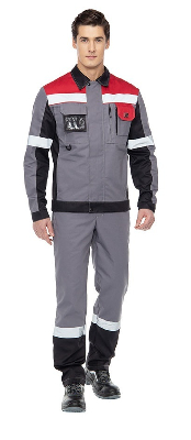 Костюм состоит из куртки и полукомбинезона. Куртка с застежкой на молнию под планкой на липучках и кнопках. Многофункциональные нагрудные карманы (в т. ч. для паспорта), объемный карман для средств связи, накладной карман с отделением для ручки и съемный карман под бэйдж. Пластиковое полукольцо для крепления пропуска. Нижние карманы в швах рельефов. Воротник отложной. Широкий пояс по низу куртки с хлястиками на липучке. Рукава с манжетами на кнопке. Полукомбинезон с гульфиком на молнии, с регулировкой объема по талии спинки, со шлевками на поясе. На одной из шлевок спереди пластиковое полукольцо. Бретели с регулировкой длины и с застежкой на фастексы. На грудке накладные карманы. На передних половинках верхние боковые карманы. На задних половинках верхние накладные карманы и карманы для инструментов. По низу кокеток, на рукавах куртки и по низу полукомбинезона световозвращающие полосы.
